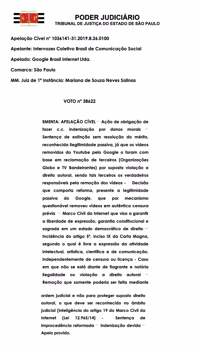 Quando elas abusam a sociedade tem como contestar no Poder Judiciário, como fez o Intervozes ao ter vídeos removidos sob o pretexto de violação de direitos autorais pela ferramenta do YouTube denominada de Content ID. Neste caso, apesar de ainda haver recurso, o Tribunal de Justiça de São Paulo, no dia 15 de dezembro de 2020, entendeu que a prática adotada pelo Google foi abusiva e condenou a empresa a reinserir os conteúdos ilegalmente removidos e a pagar indenização por danos morais no valor de R$ 50 mil, tendo afirmado o seguinte: