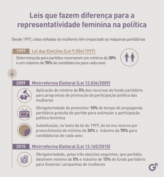Enquanto a ampla reforma eleitoral não chega, as cotas vão dando o tom da busca pela equidade. Em vigor desde 2015, a Lei 13.165 complementa a Lei das Eleições, obrigando partidos a destinar de 5 a 15% do fundo partidário para as candidaturas das mulheres e a garantir a elas no mínimo 10% do tempo total que têm de propagando eleitoral.